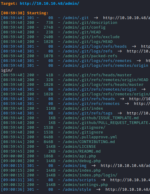 dirsearch -e php,asp,aspx,jsp,py,txt,conf,config,bak,backup,swp,old,db,sql -u http://10.10.10.48/admin