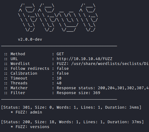 ffuf -w /usr/share/wordlists/seclists/Discovery/Web-Content/directory-list-2.3-medium.txt:FUZZ -u http://10.10.10.48/FUZZ -ic -fs 369
