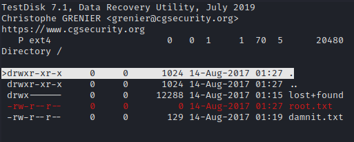 I was not able to recover contents of root.txt but now that I know that it used to be present on disk, I tried to reveal more data by running strings command against image file. This revealed the root flag.