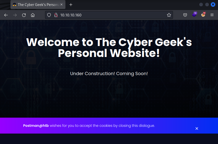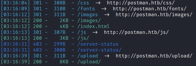 The front page of website reveals possible host name Postman. I added it to /etc/hosts with postman.htb.