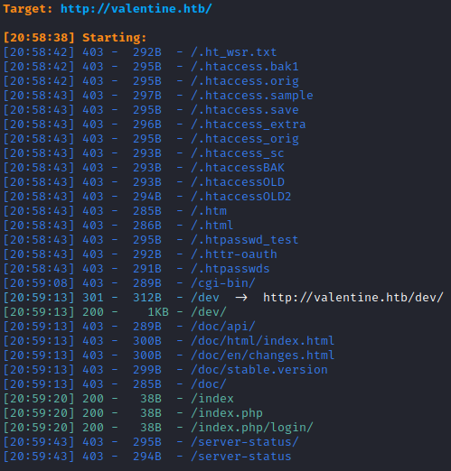 dirsearch -e php,asp,aspx,jsp,py,txt,conf,config,bak,backup,swp,old,db,sql -u http://valentine.htb