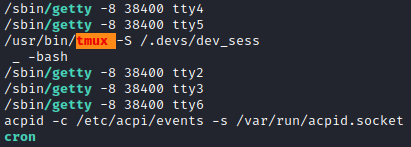 Running linpeas.sh revealed that root is running /usr/bin/tmux -S /.devs/dev_sess command.
