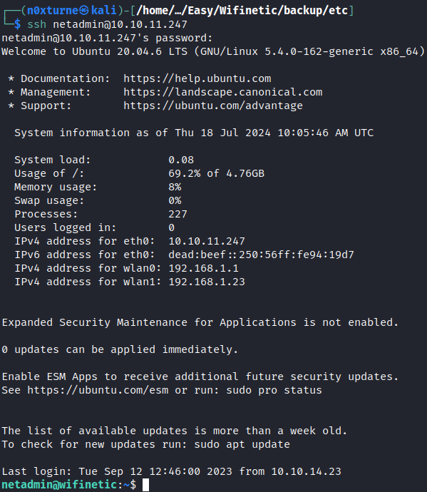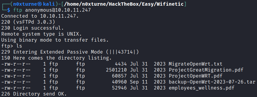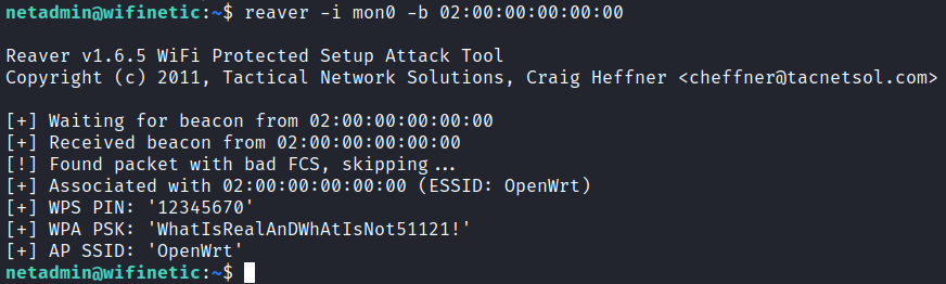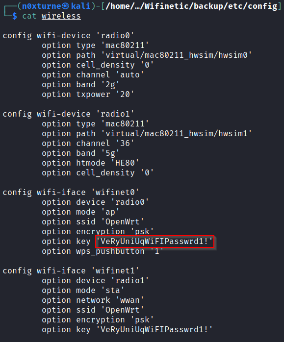 By using anonymous login, I was able to access ftp server. There are several files listed there, so I downloaded them to my local machine for further inspection. Most interesting file is backup-OpenWrt-2023-07-26.tar. After extracting backup file, I got access to /etc/ directory. By inspecting contents of files inside, I found valid credentials that allowed me to ssh into the system as user netadmin. While enumerating system as user netadmin I discovered wireless interfaces and used iwconfig to display more information about them. One of these interfaces, namely mon0, was in monitor mode. This can be exploited by doing WPS brute-force. To perform this attack we need wireless interface in monitoring mode (mon0) and BSSID of the Access Point. To obtain BSSID, I used iw dev command. I was able to perform this attack using reaver tool, which was pre-installed on the system. A successful attack resulted in obtaining WPA password, which can be used to gain root access to the system.