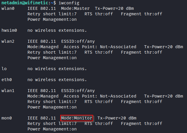 It is worth noting that the mon0 interface is in monitor mode. Monitor mode allows wifi interface to monitor all traffic on the wireless network.